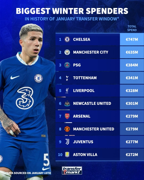 7.47亿欧! 冬窗总支出: 切尔西居榜首, 前10英超8队, 尤文上榜